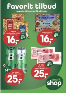 Favorit tilbuddene gælder til og med 19. oktober, husk vi har også weekend tilbud fredag – lørdag og søndag på 10 Gestus skrabeæg til kun 20 kr. og som rosinen i pølse enden har vi hver fredag Bland selv slik til kun 9.95 pr 100 gr.