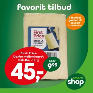 First Price ost – KUN 45,-.Mild og alsidig – perfekt til morgenbordet, toasten eller ostemaden i madpakken